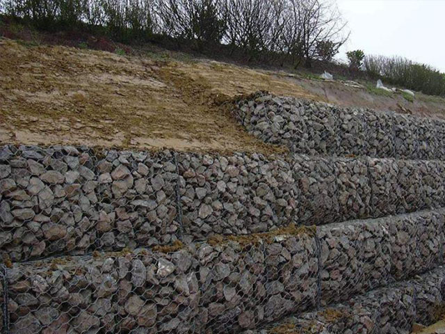 加筋石籠網 鉛絲石籠網是由金屬線材編織成角形網(六角網)組裝而成的網箱,由于編織的金屬線材類似鉛絲,因此叫鉛絲石籠網。根據工程設計要求組裝成箱籠,并裝入塊石等填充料后連接成一體,用做堤防、路基防護、護坡護岸等工程......